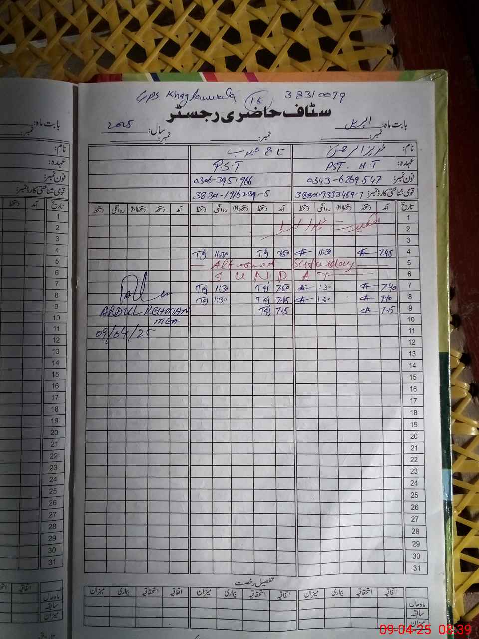 | Name: Az**** UrRe**** Designation: (School Headmaster's/Headmistress's) PST Phone/Cell Number: 03**** |