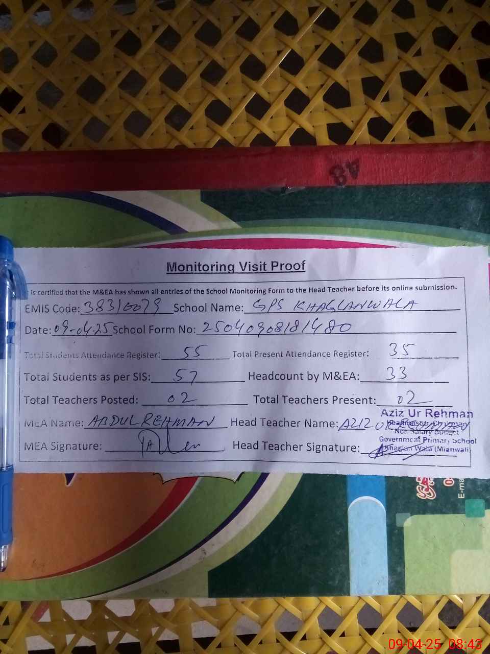 | Attendance Register | Head Teacher | MEA with School | Visit Proof |