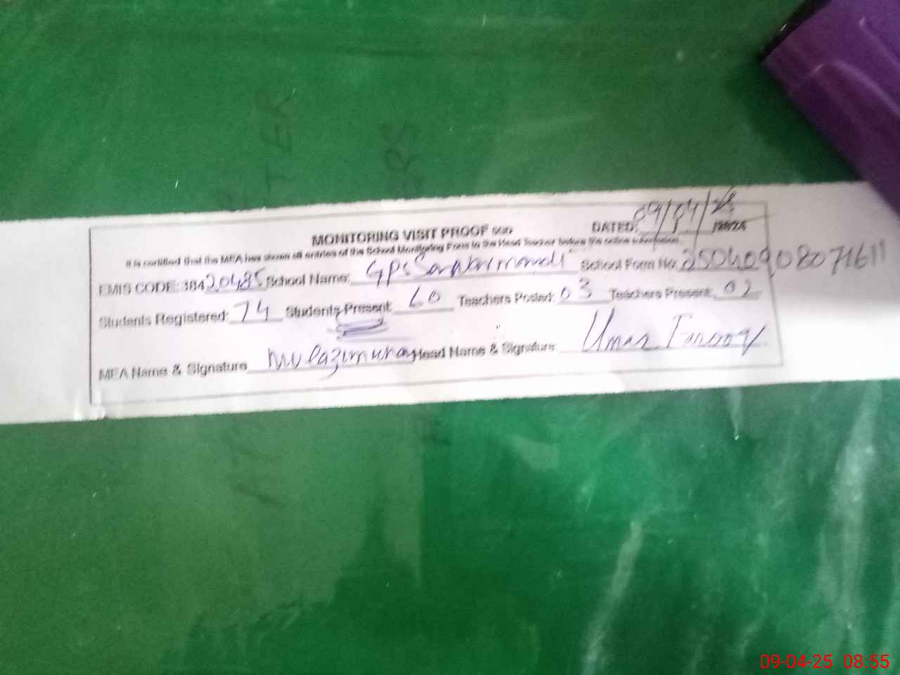 | Attendance Register | Head Teacher | MEA with School | Visit Proof |