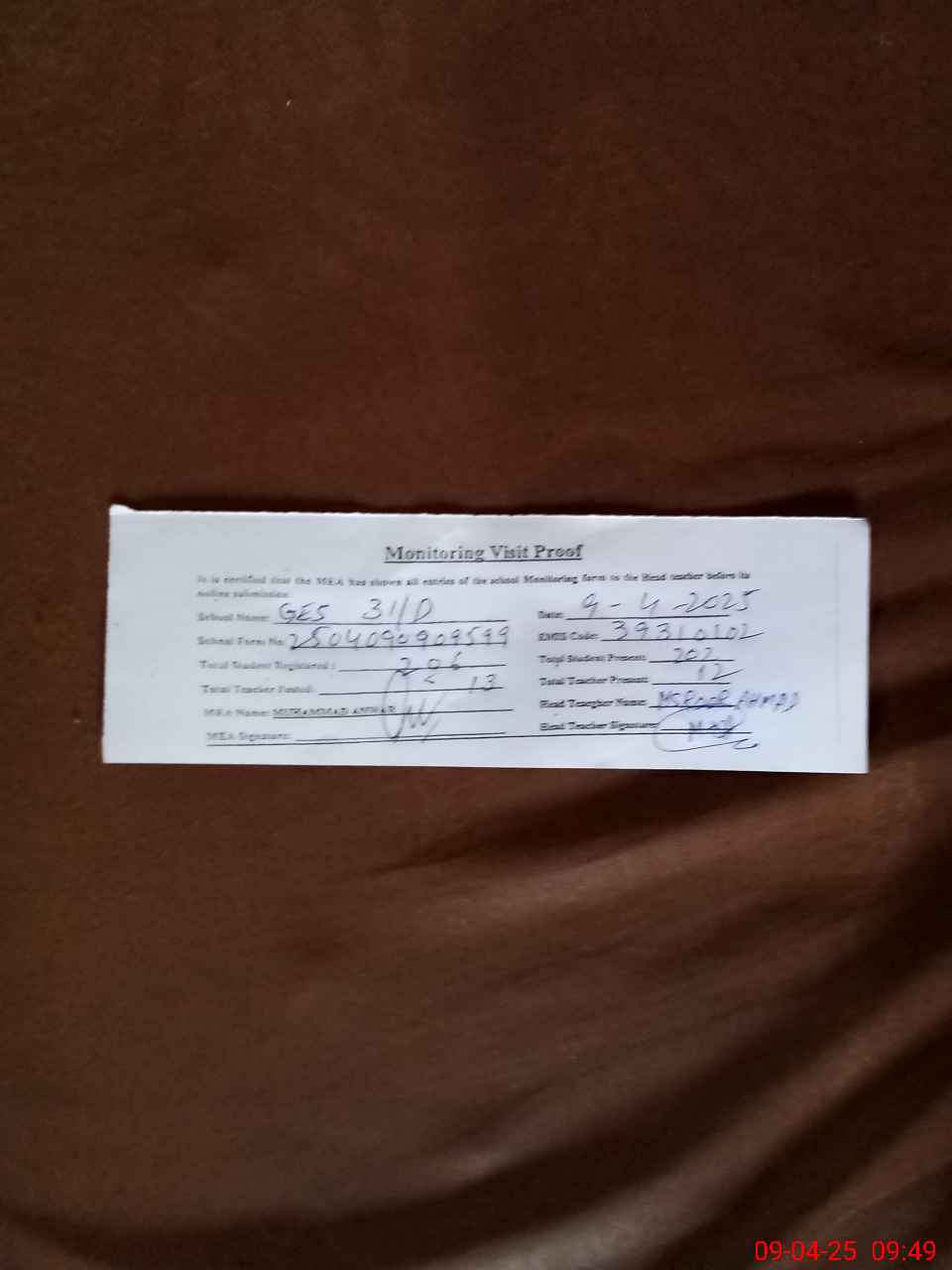 | Attendance Register | Head Teacher | MEA with School | Visit Proof |