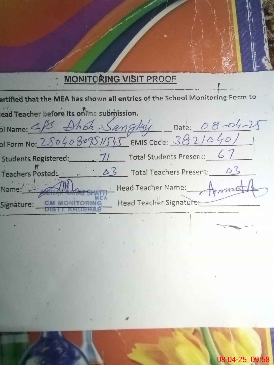 | Attendance Register | Head Teacher | MEA with School | Visit Proof |