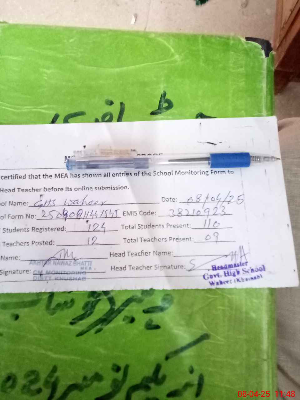 | Attendance Register | Head Teacher | MEA with School | Visit Proof |