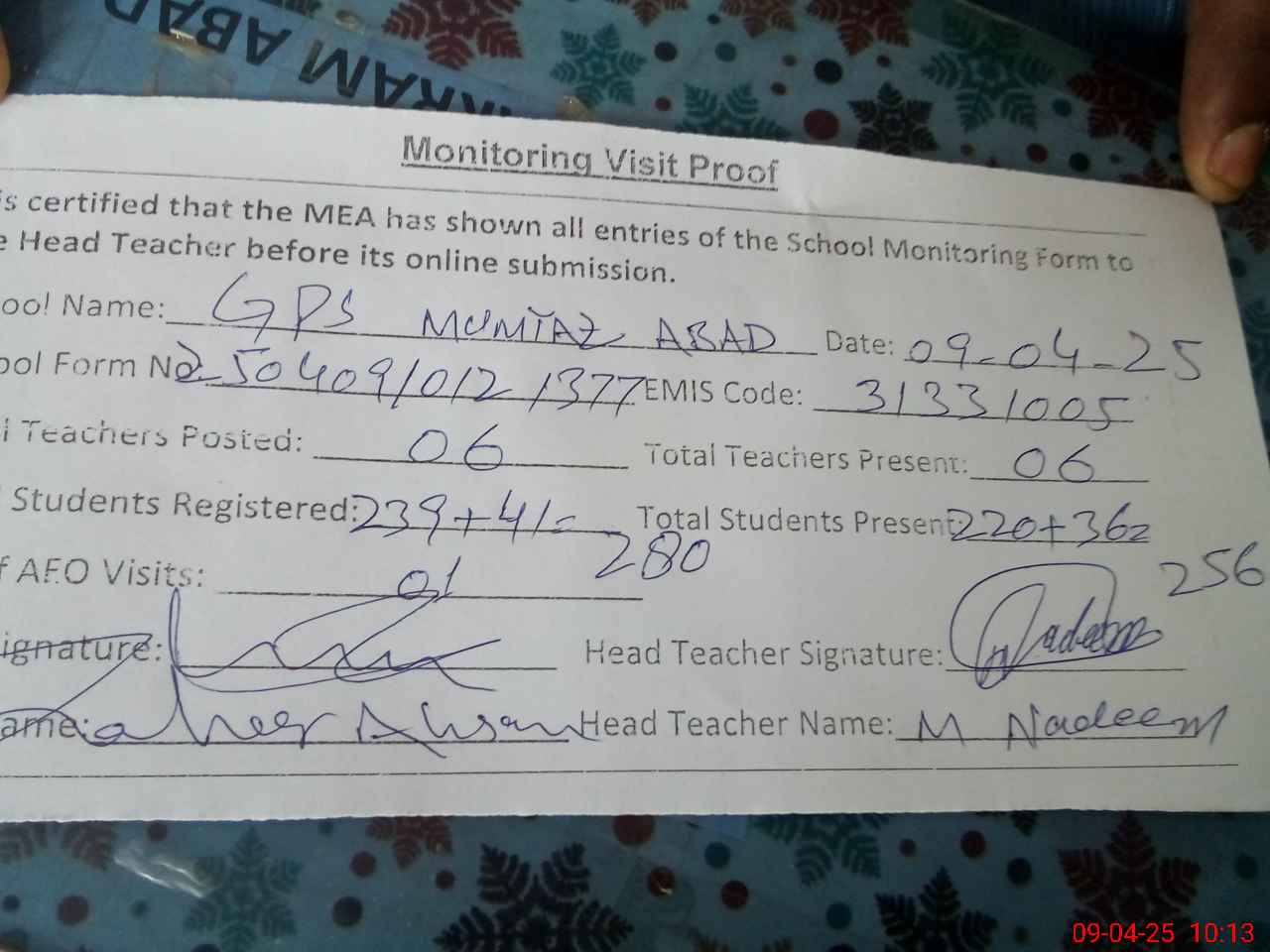 | EMIS Code: 31331005 | Name of School: GPS MUMTAZ ABAD | |||