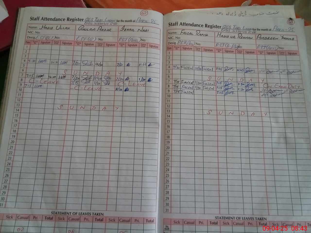 | CNIC | Full Name | Designation | R/C | Absence During Last Calender Month |