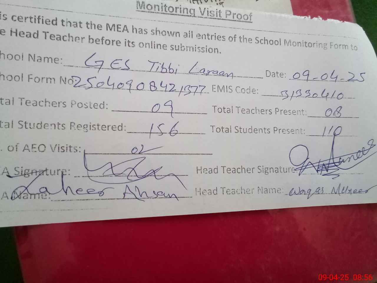 | Attendance Register | Head Teacher | MEA with School | Visit Proof |