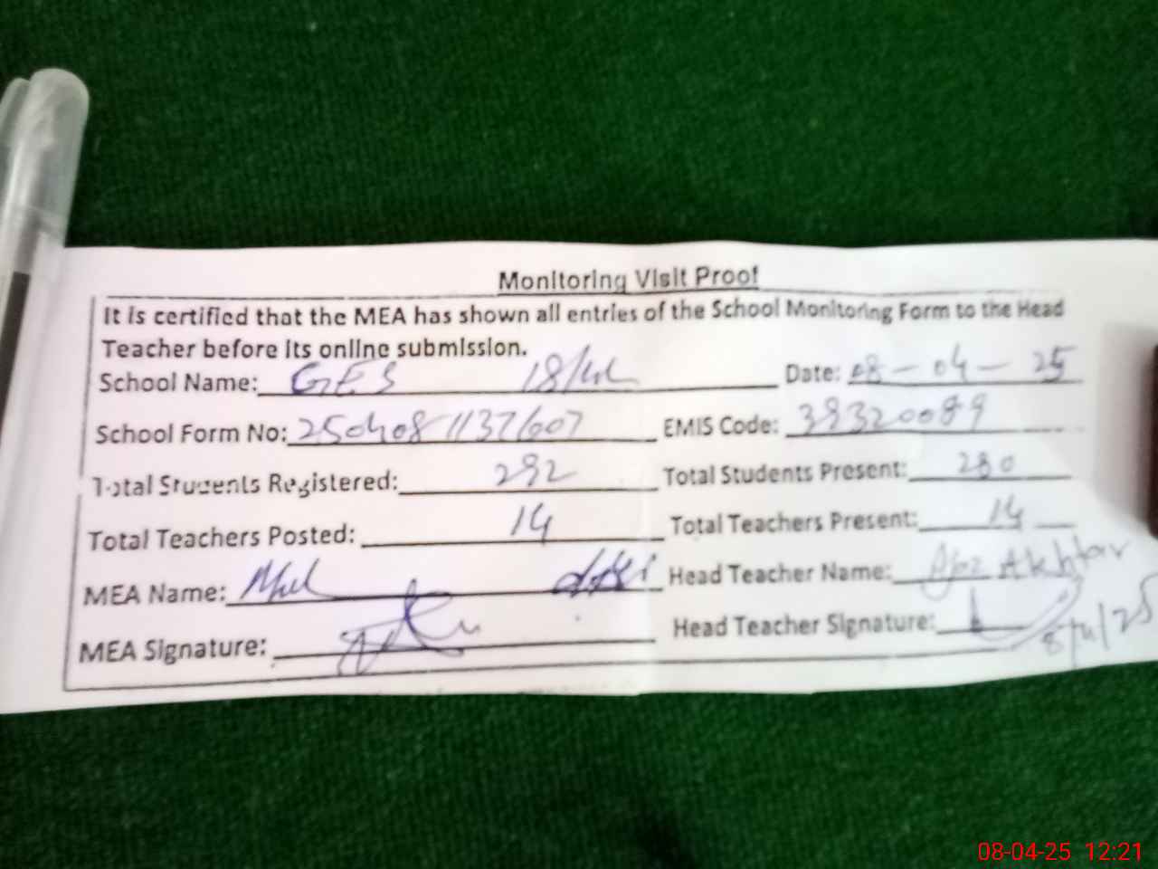 | Attendance Register | Head Teacher | MEA with School | Visit Proof |