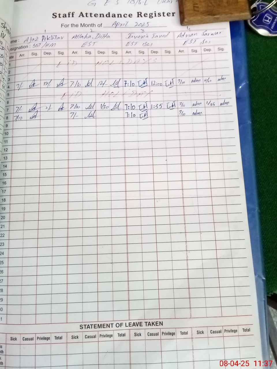 | Leave | Duty | Absent | Maternity | Medical | Ex- Pak |
