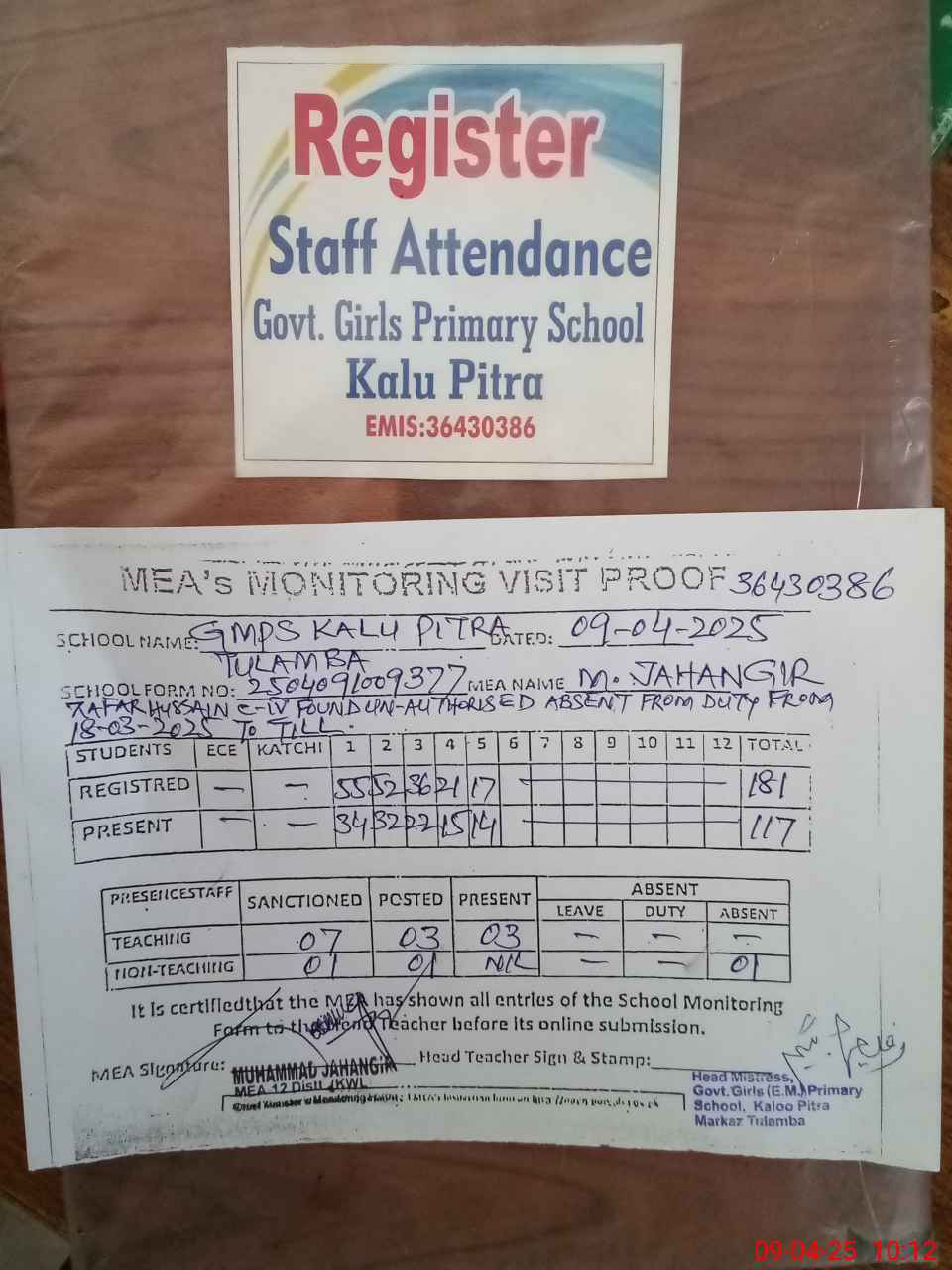 | Attendance Register | Head Teacher | MEA with School | Visit Proof |