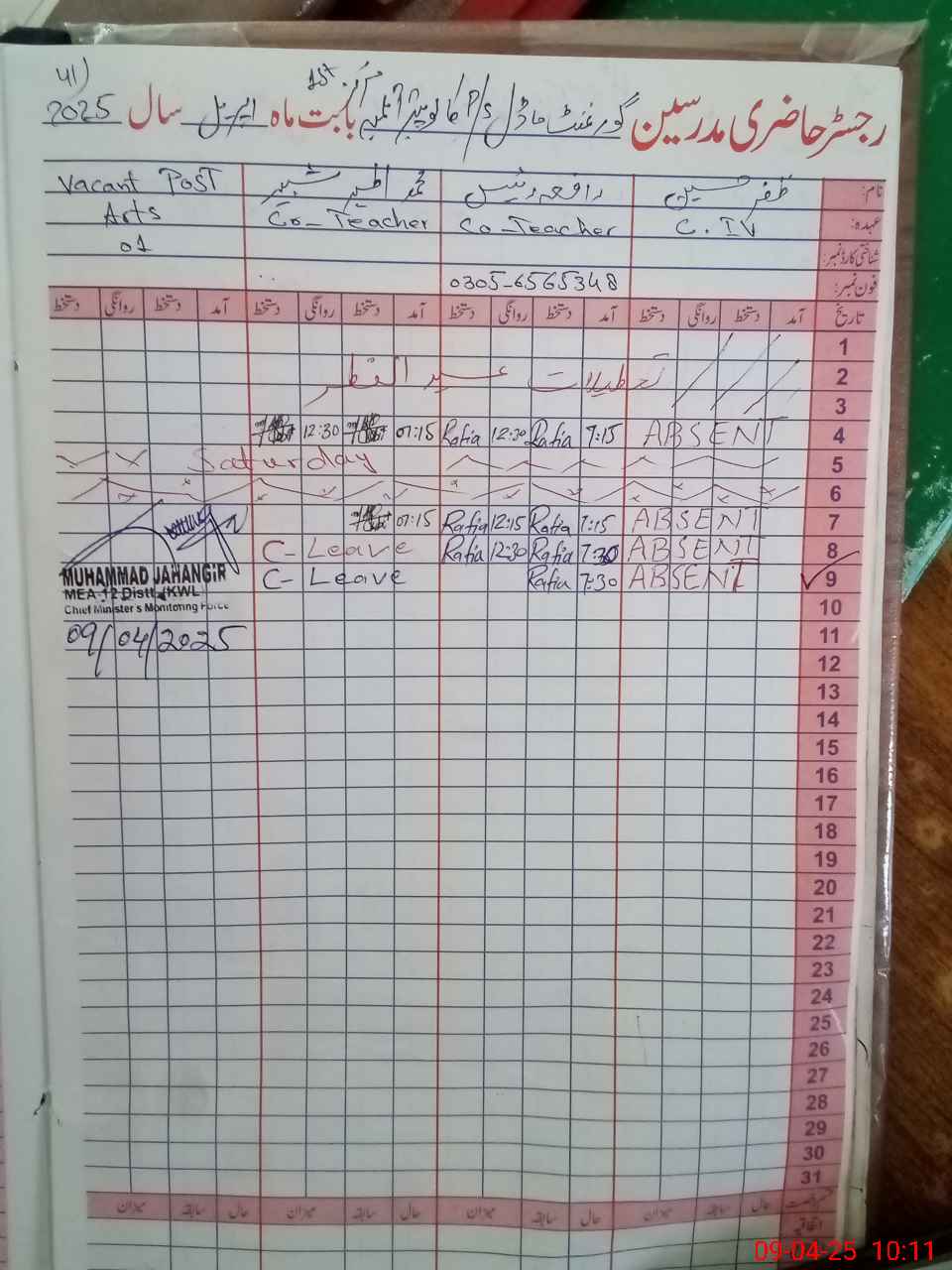 | Remarks (Use Separate Page if Required): THIS SCHOOL IS INSAF AFTERNOON SCHOOL ZAFAR HUSSAIN CIV FOUND UN AUTHORISED ABSENT FROM DUTY FROM 18 MARCH 2025 TO TILL NSB GRANTS AND FTF RECORDS ARE NOT AVAILABLE FORMS D4 FOR DISTRIBUTION OF BOOKS ARE NOT AVAILABLE LESSON PLANS ARE NOT AVAILABLE ONLY ONE HAND WASHING POINT IS WITH SOAP IN BOYS PORTION REMAINING ALL HAND WASHING POINTS ARE WITHOUT SOAP RANDOM CLASS TWO IS NOW IN CLASS SEVEN AND BOYS ARE PASSED OUT FROM THIS SCHOOL | |||||