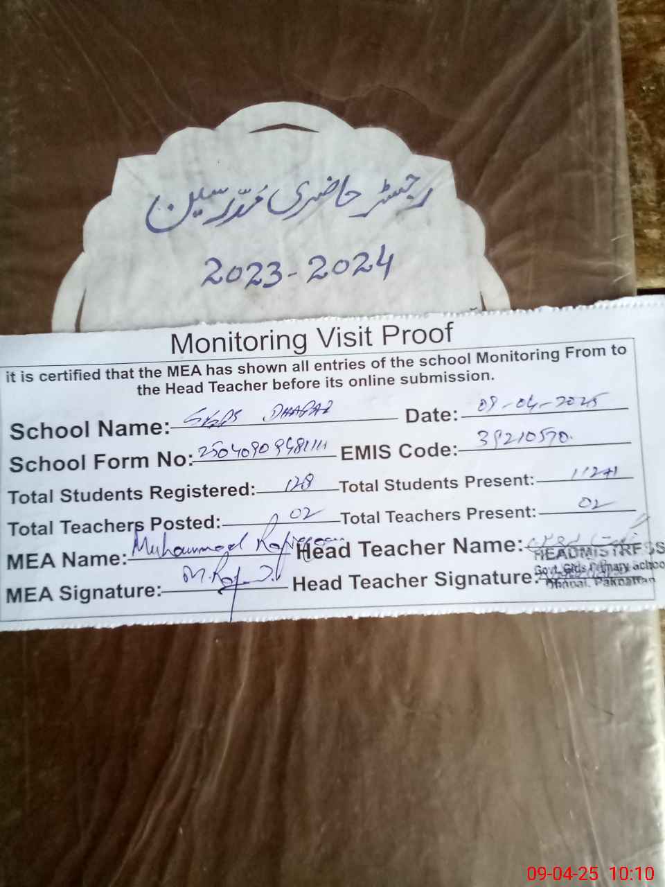 | Attendance Register | Head Teacher | MEA with School | Visit Proof |