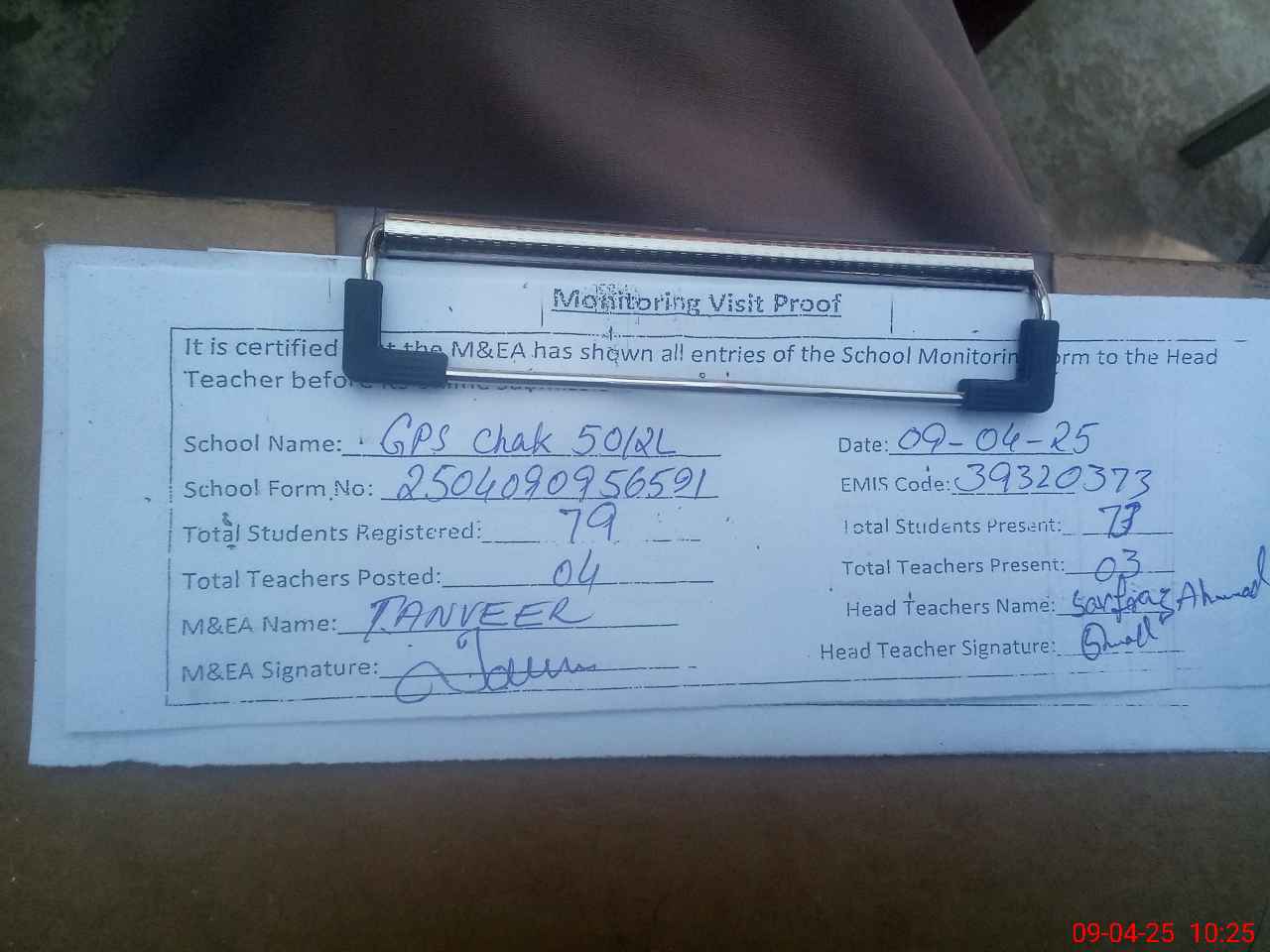 | Attendance Register | Head Teacher | MEA with School | Visit Proof |