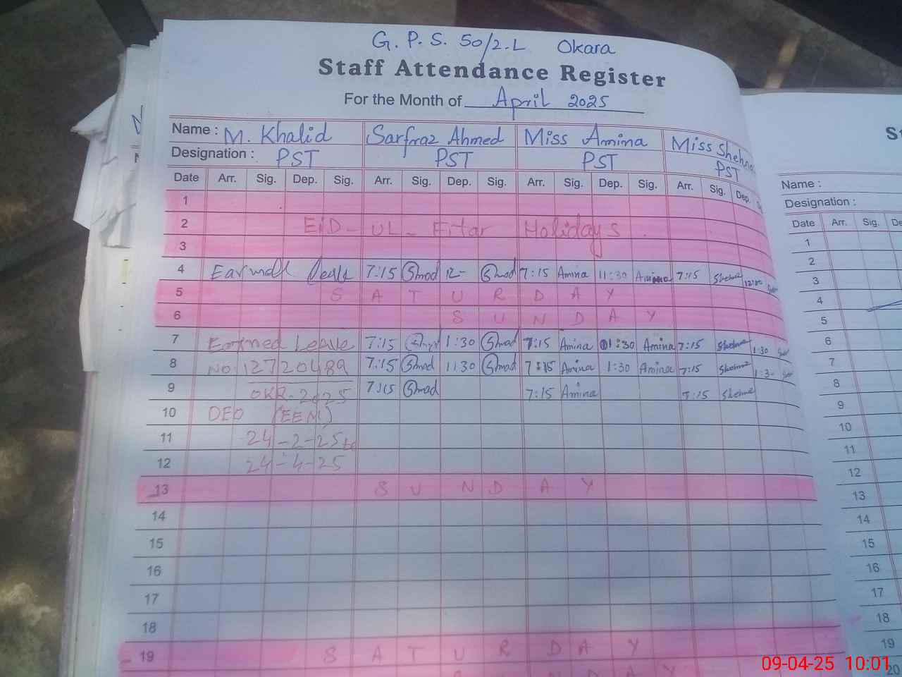 | CNIC | Full Name | Designation | R/C | Absence During Last Calender Month |