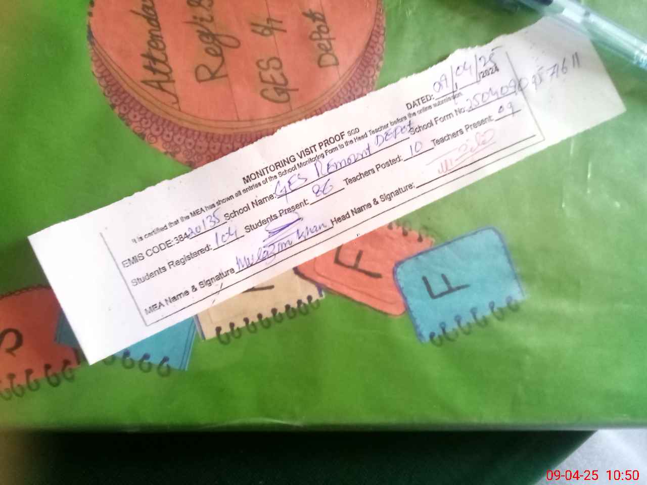| Attendance Register | Head Teacher | MEA with School | Visit Proof |