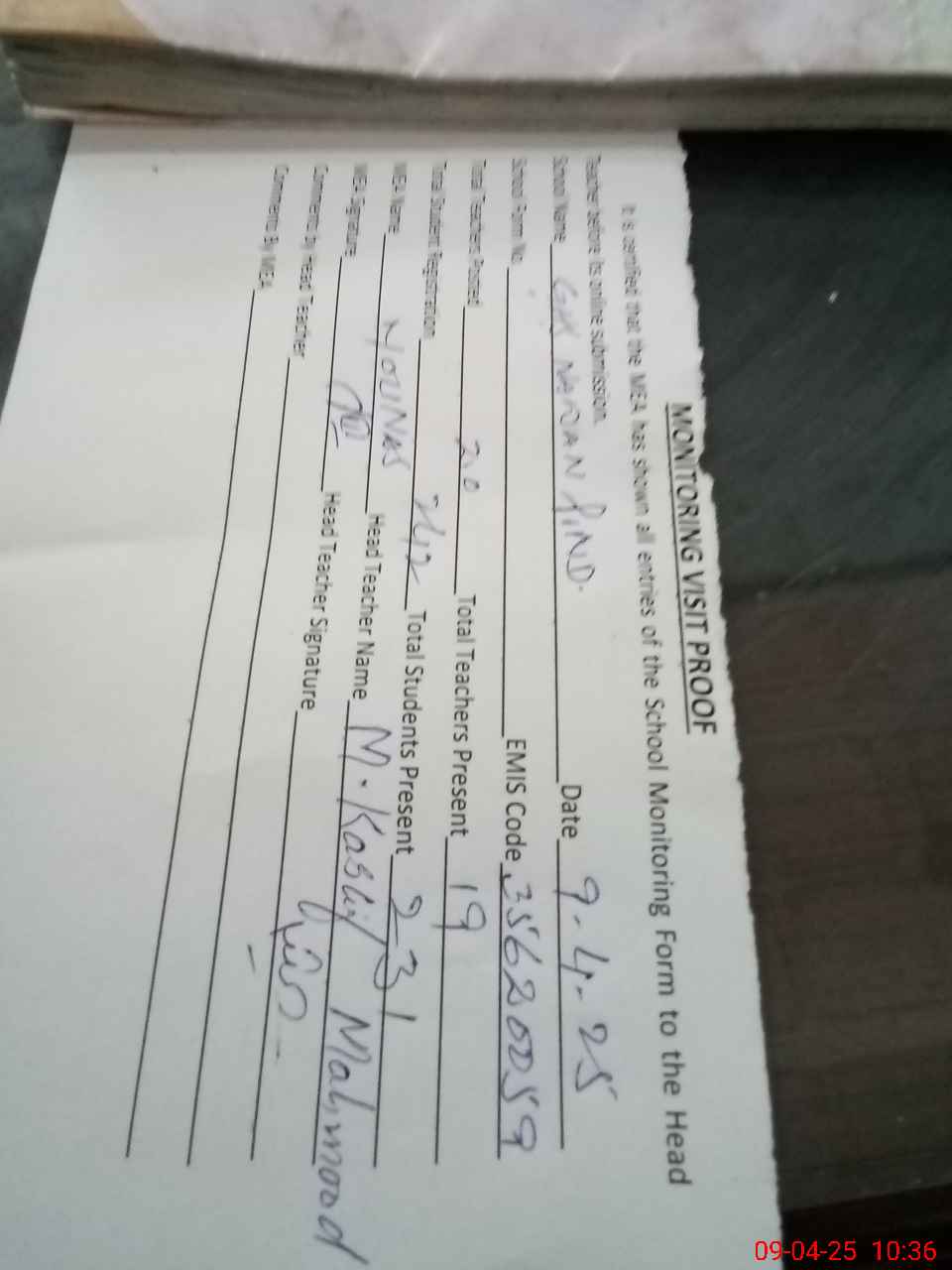 | Attendance Register | Head Teacher | MEA with School | Visit Proof |