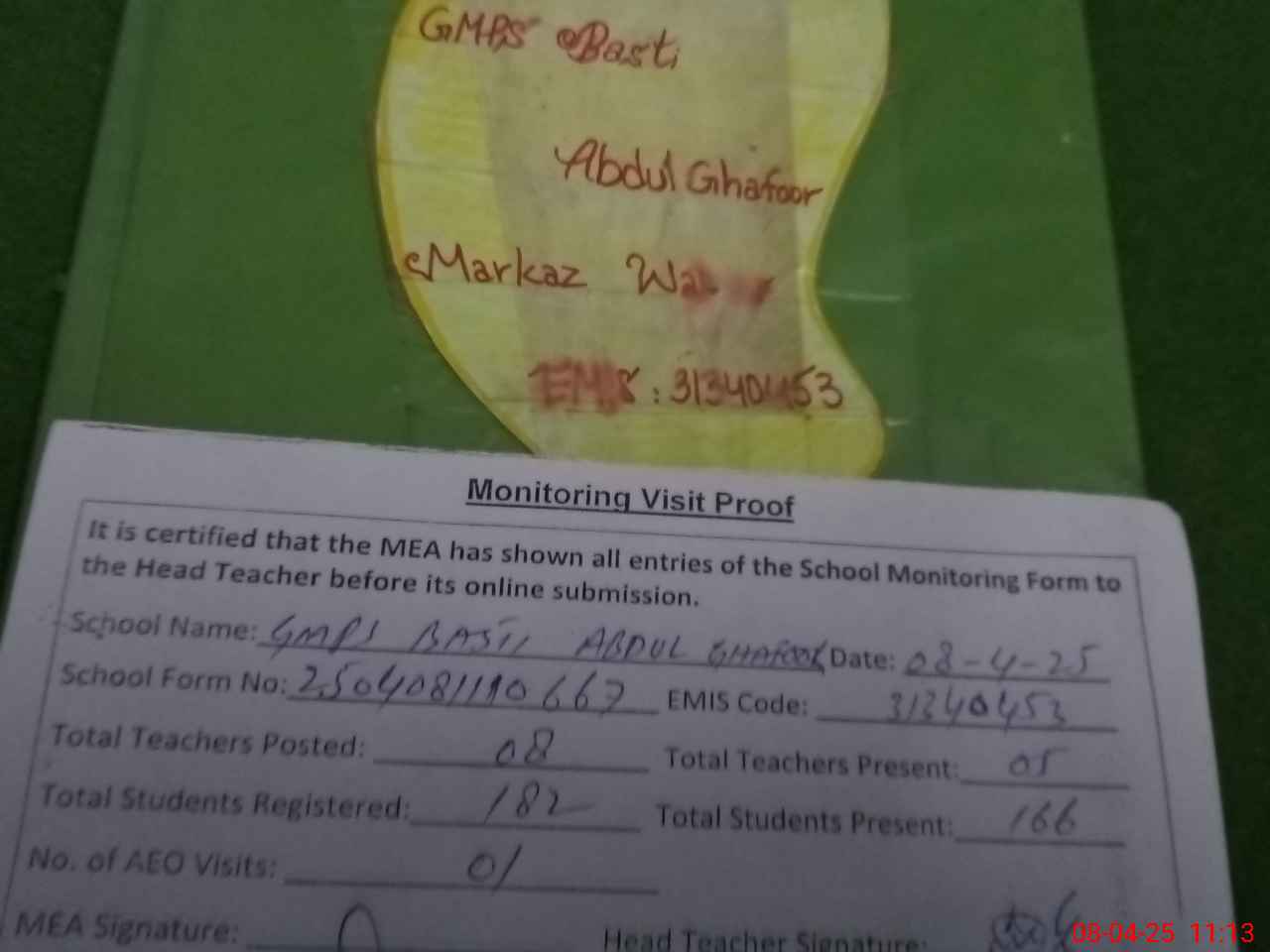 | Attendance Register | Head Teacher | MEA with School | Visit Proof |