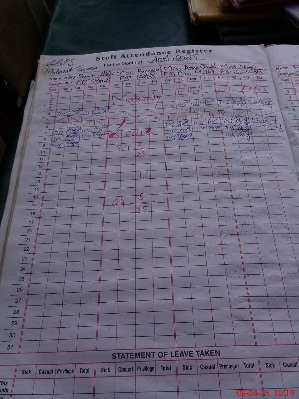 | Leave | Duty | Absent | Maternity | Medical | Ex- Pak |