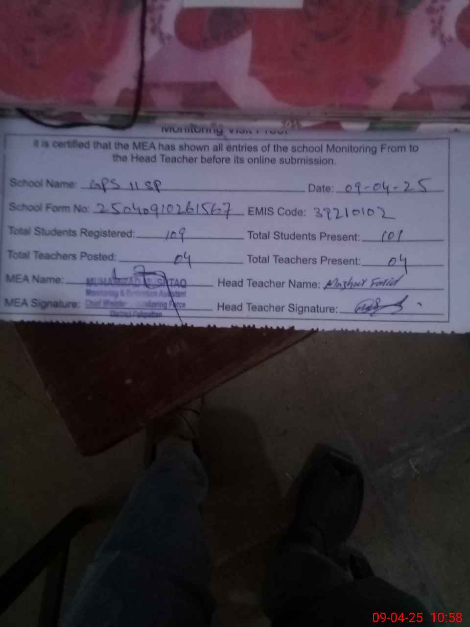 | Attendance Register | Head Teacher | MEA with School | Visit Proof |