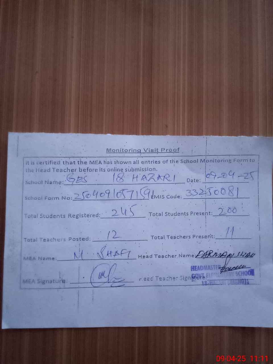 | Attendance Register | Head Teacher | MEA with School | Visit Proof |