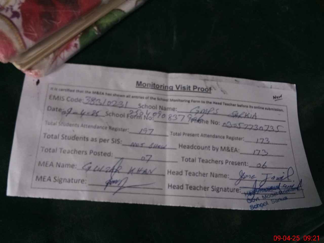 | Attendance Register | Head Teacher | MEA with School | Visit Proof |