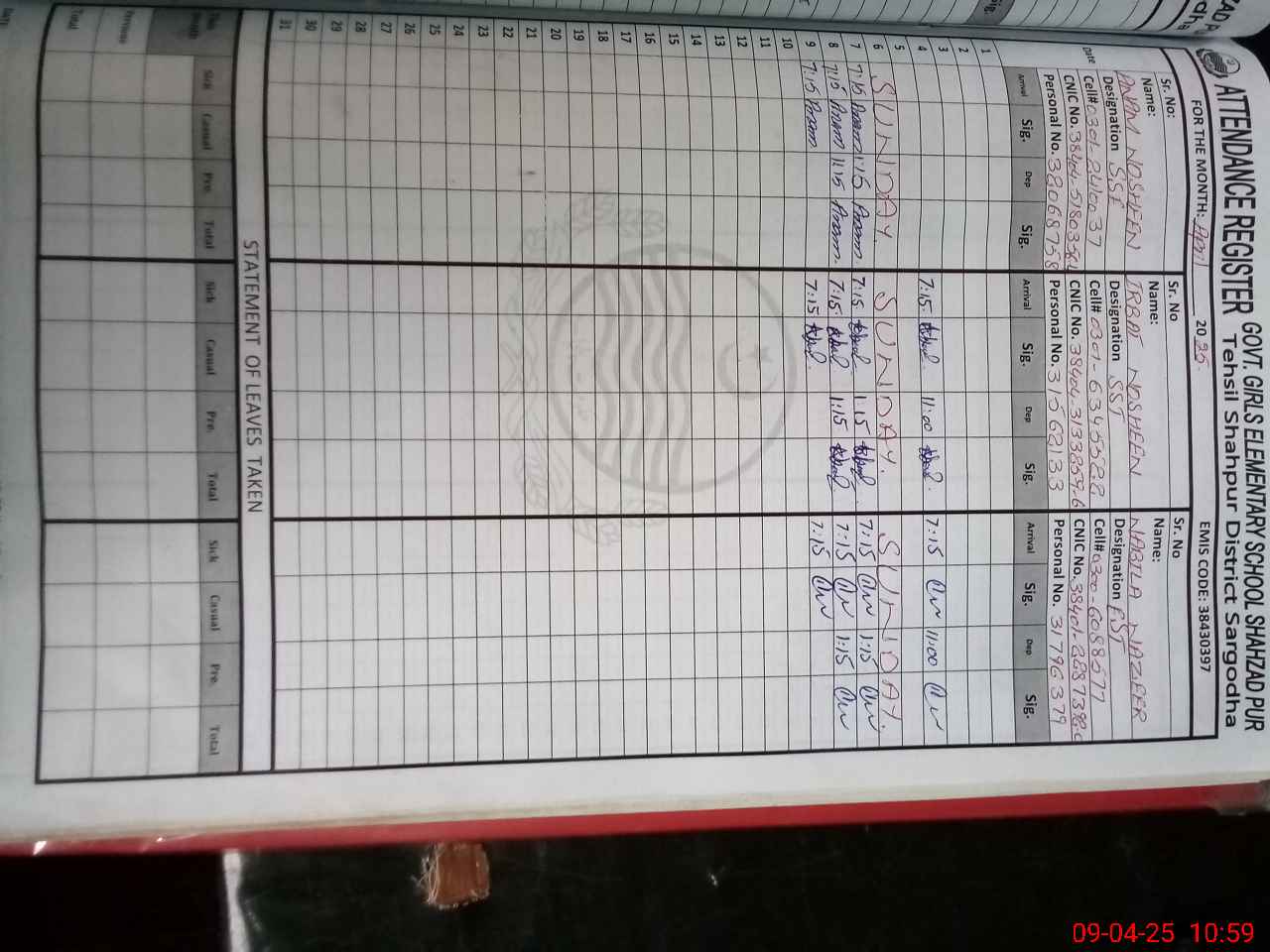 | CNIC | Full Name | Designation | R/C | Absence During Last Calender Month |