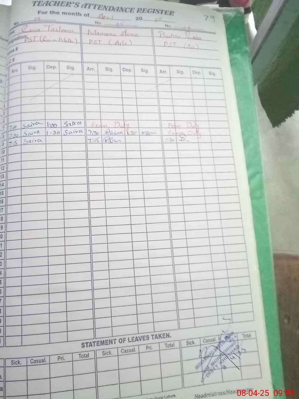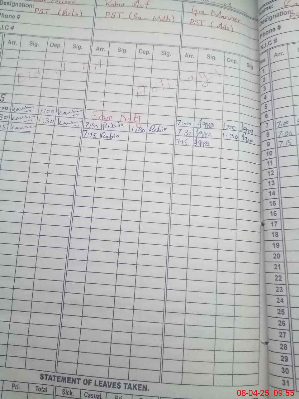 | 37**** | Bu**** Sa**** | PST | Temporary | 0 | 0 | 0 | 0 | 0 | 0 | 0 | 0 | 0 | Exam Duty |