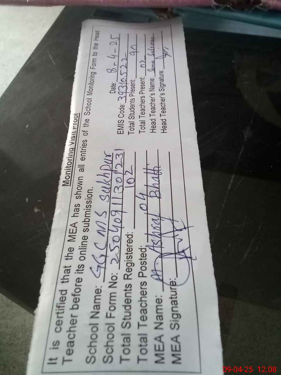 | Attendance Register | Head Teacher | MEA with School | Visit Proof |