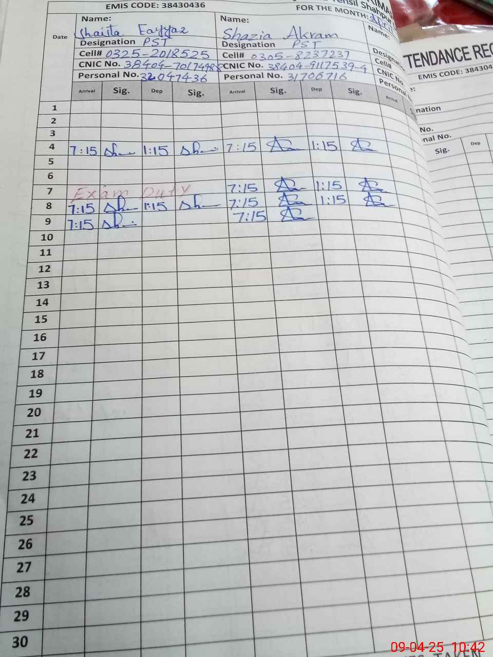 | CNIC | Full Name | Designation | R/C | Absence During Last Calender Month |