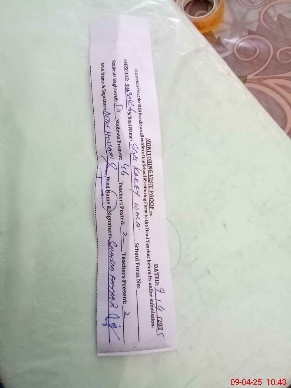 | Attendance Register | Head Teacher | MEA with School | Visit Proof |