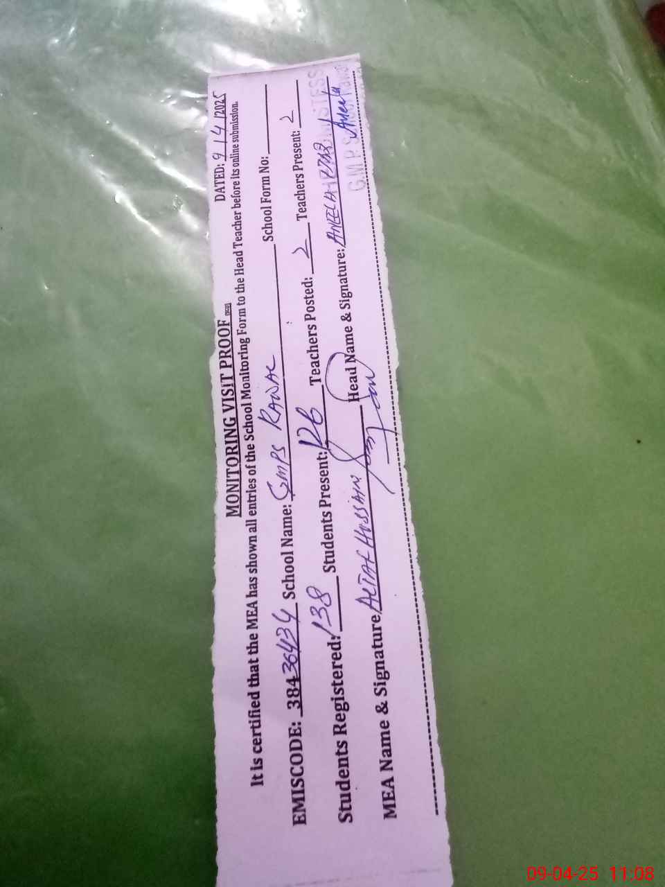| Attendance Register | Head Teacher | MEA with School | Visit Proof |