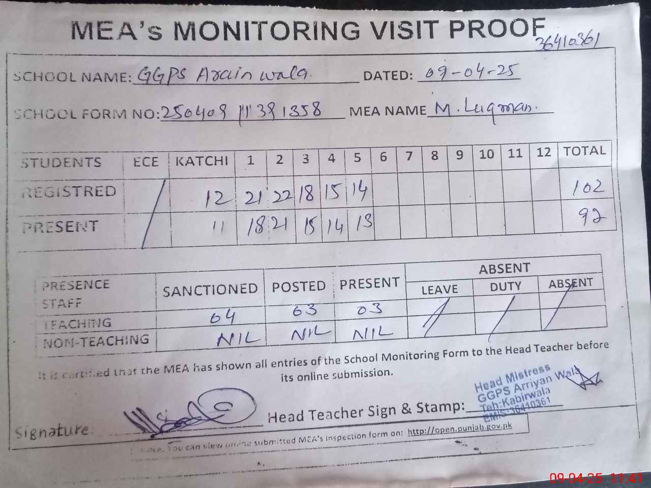 | Attendance Register | Head Teacher | MEA with School | Visit Proof |