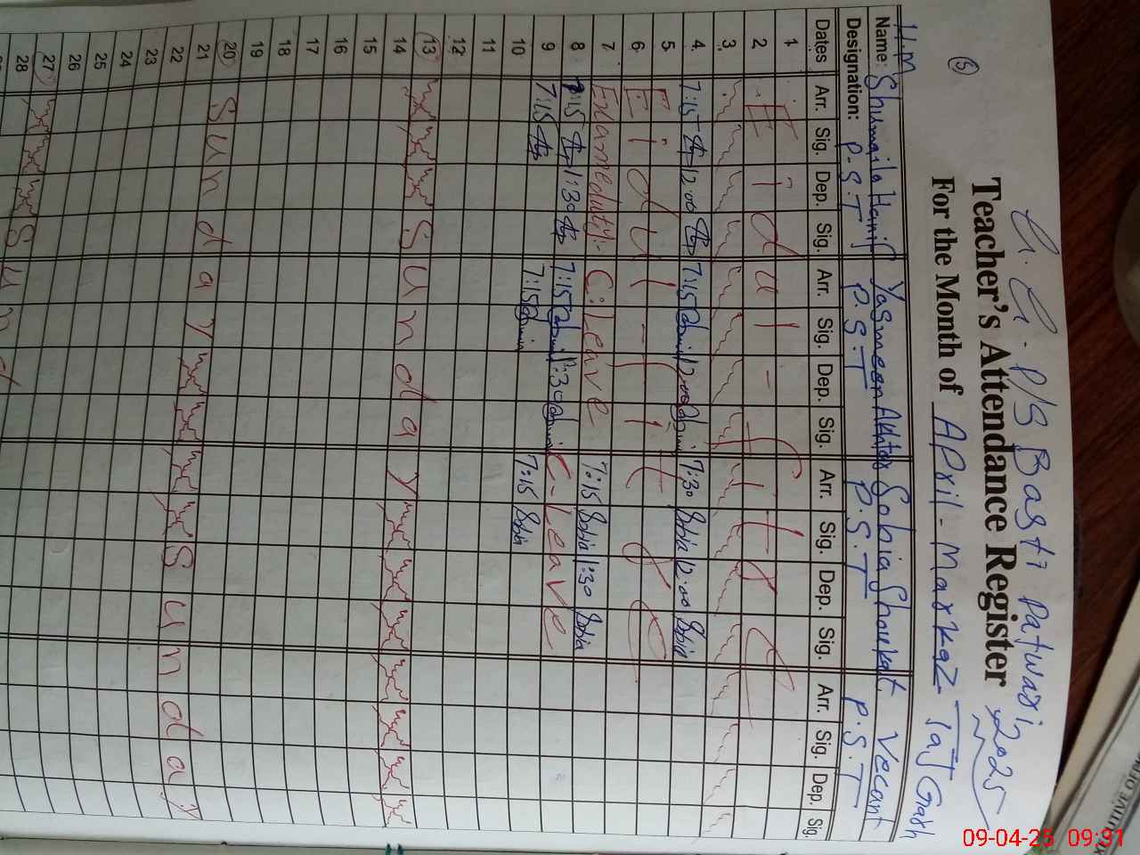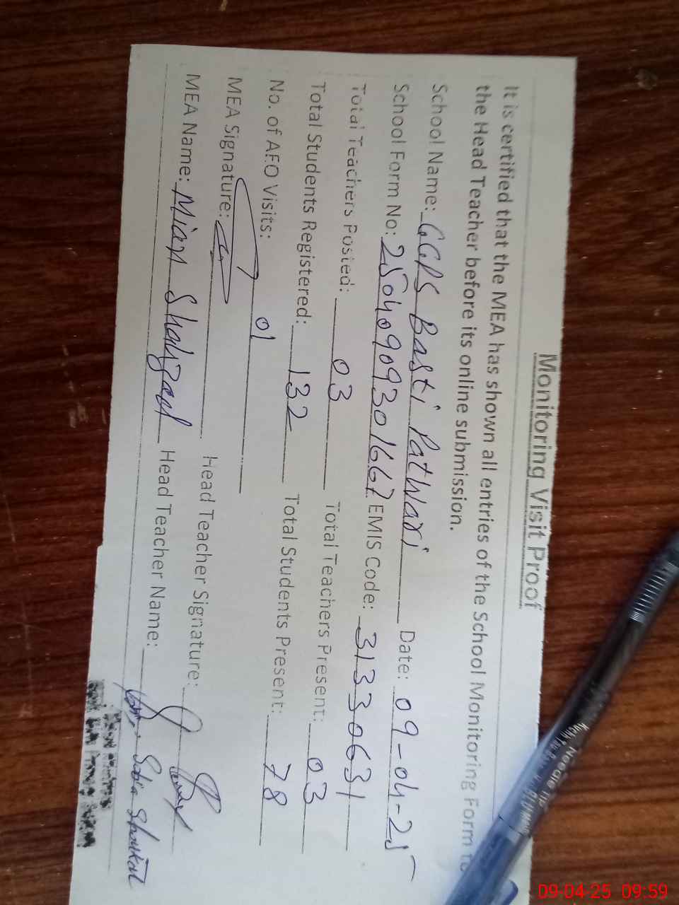 | Attendance Register | Head Teacher | MEA with School | Visit Proof |