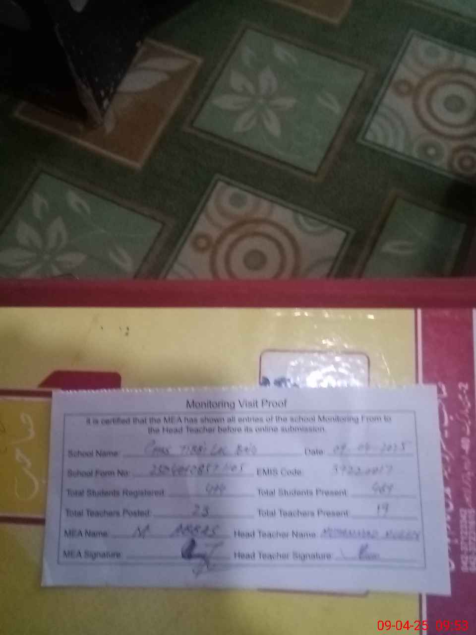 | Attendance Register | Head Teacher | MEA with School | Visit Proof |