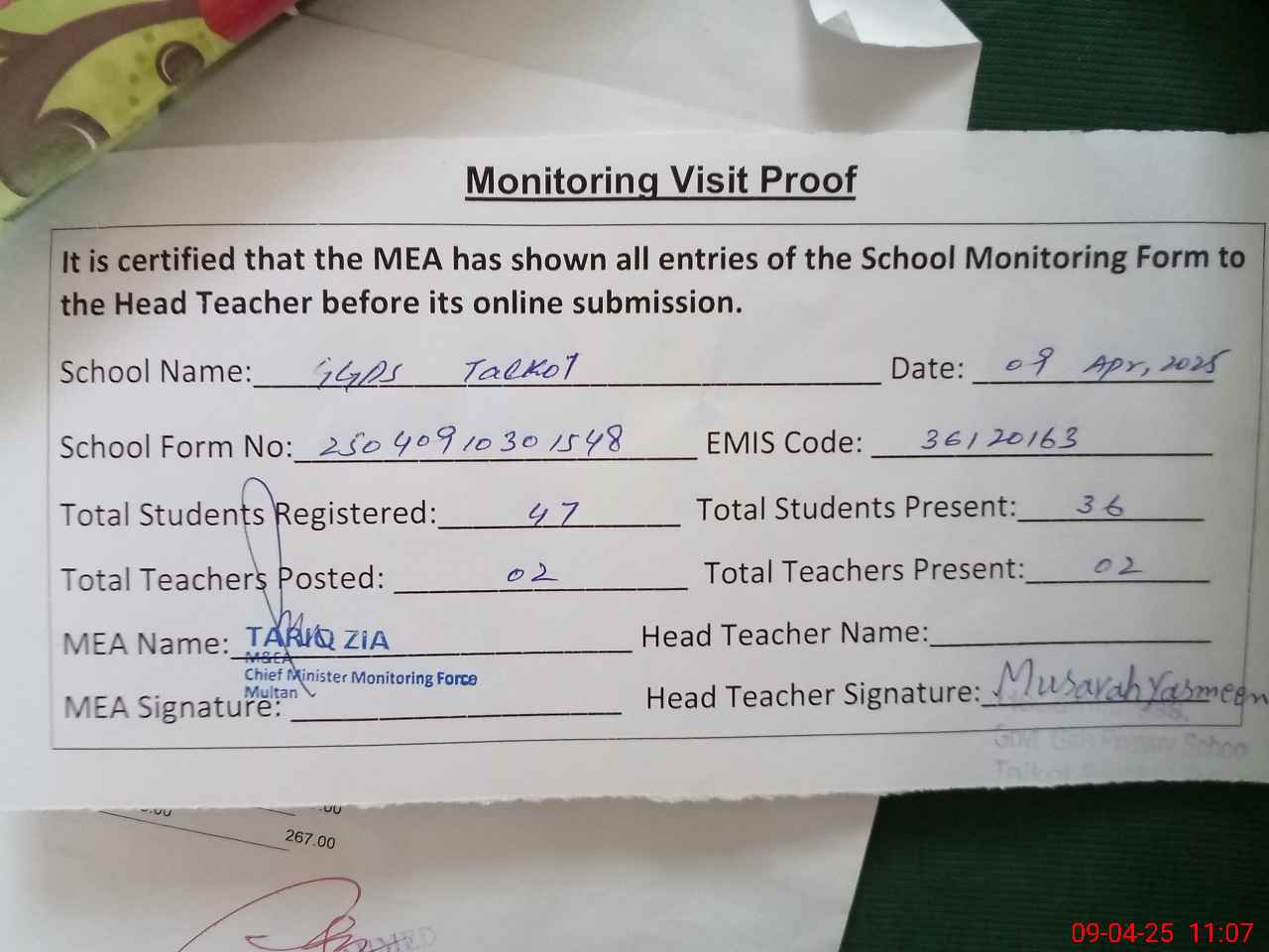 | Attendance Register | Head Teacher | MEA with School | Visit Proof |