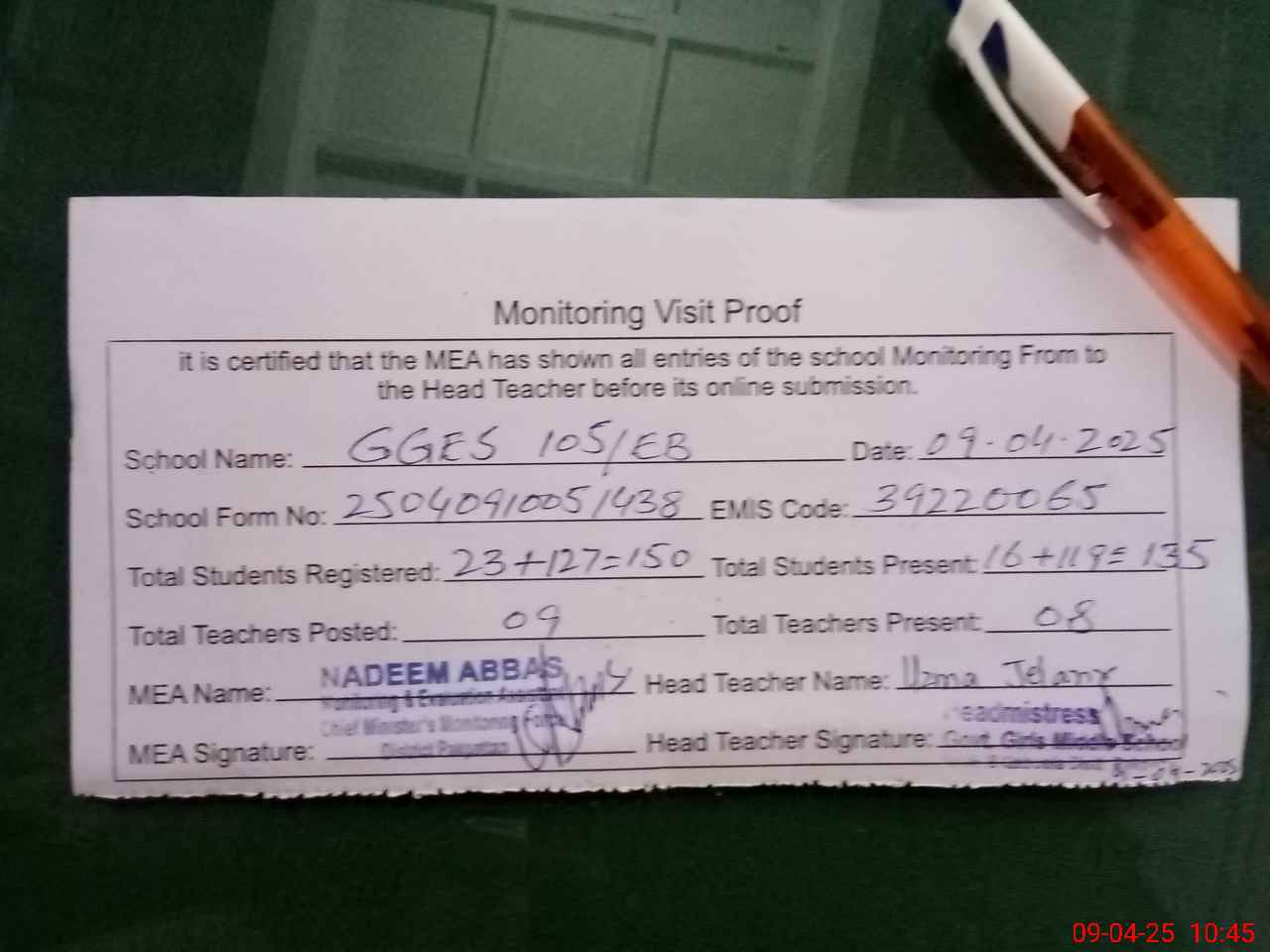 | EMIS Code: 39220065 | Name of School: GGES 105-EB | |||