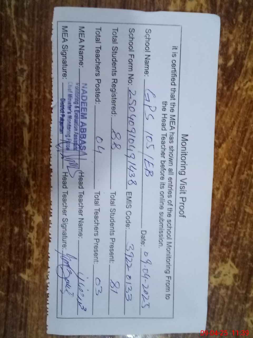 | Attendance Register | Head Teacher | MEA with School | Visit Proof |