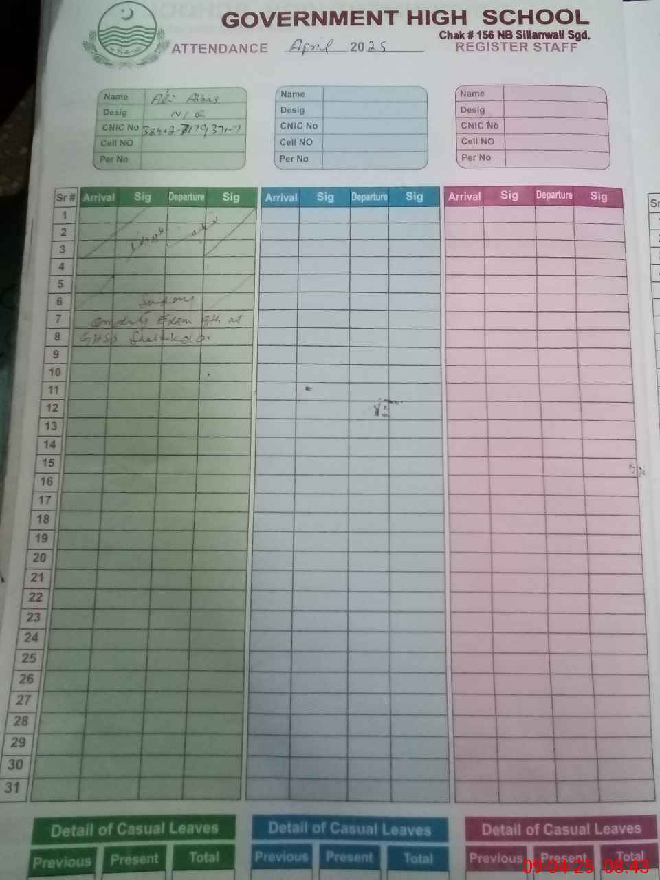 | CNIC | Full Name | Designation | R/C | Absence during last cal. month |