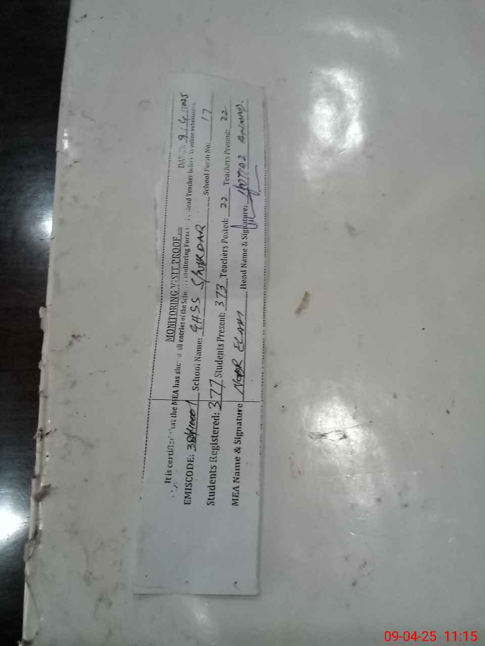 | Attendance Register | Head Teacher | MEA with School | Visit Proof |