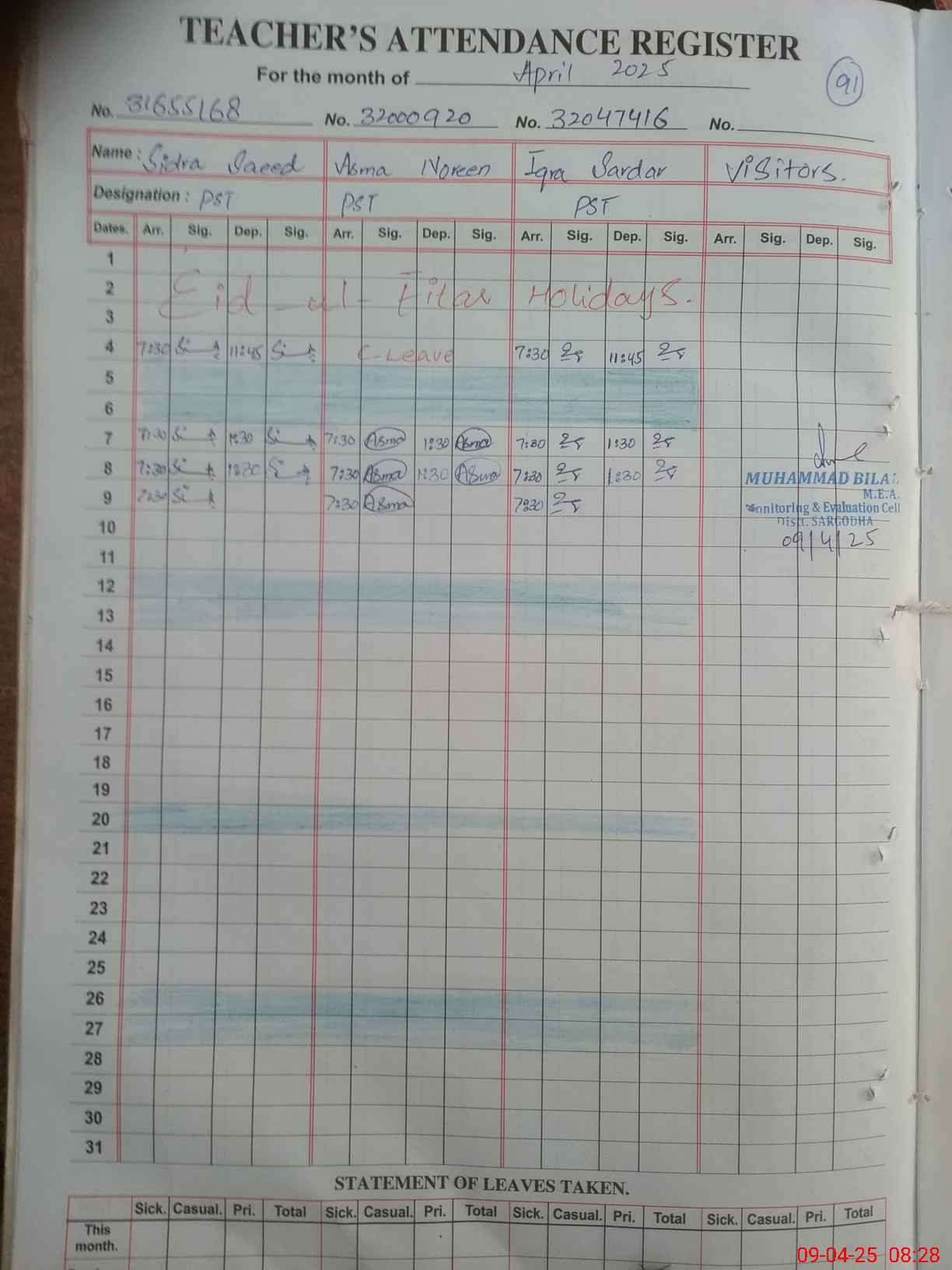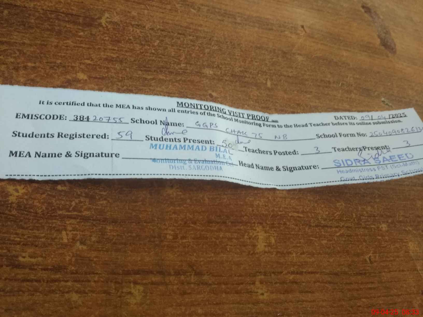 | Attendance Register | Head Teacher | MEA with School | Visit Proof |