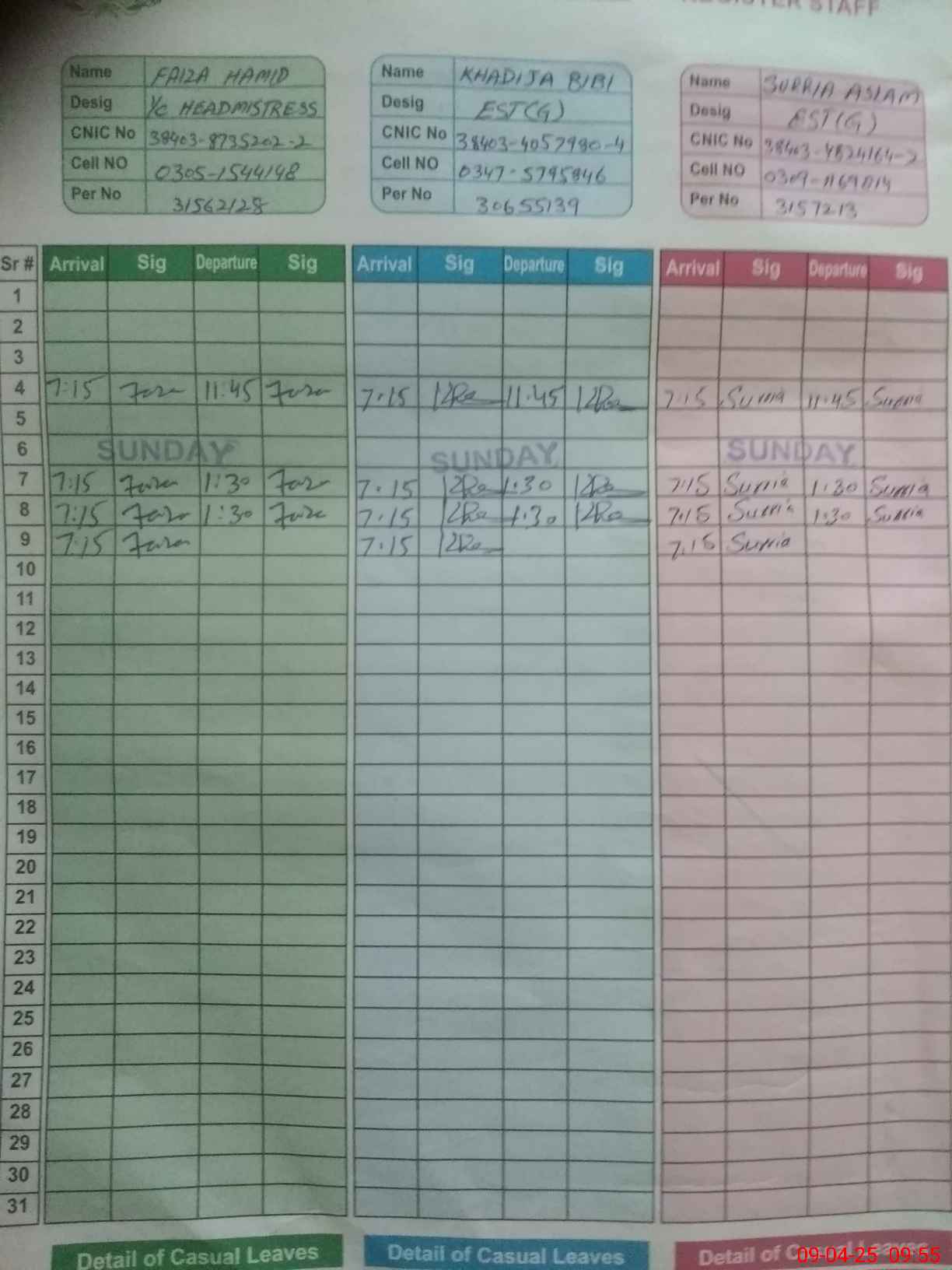 | CNIC | Full Name | Designation | R/C | Absence During Last Calender Month |