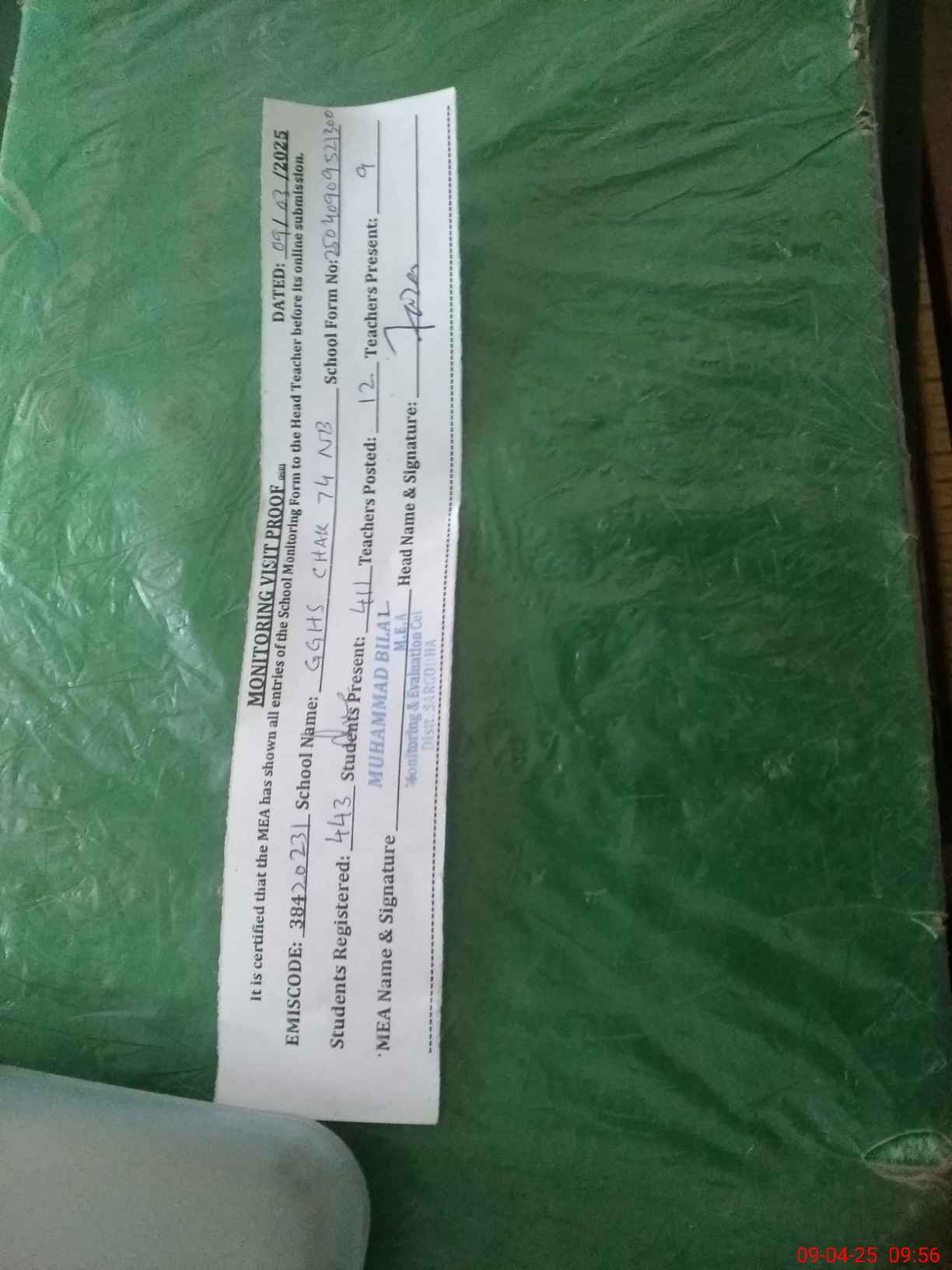| Attendance Register | Head Teacher | MEA with School | Visit Proof |