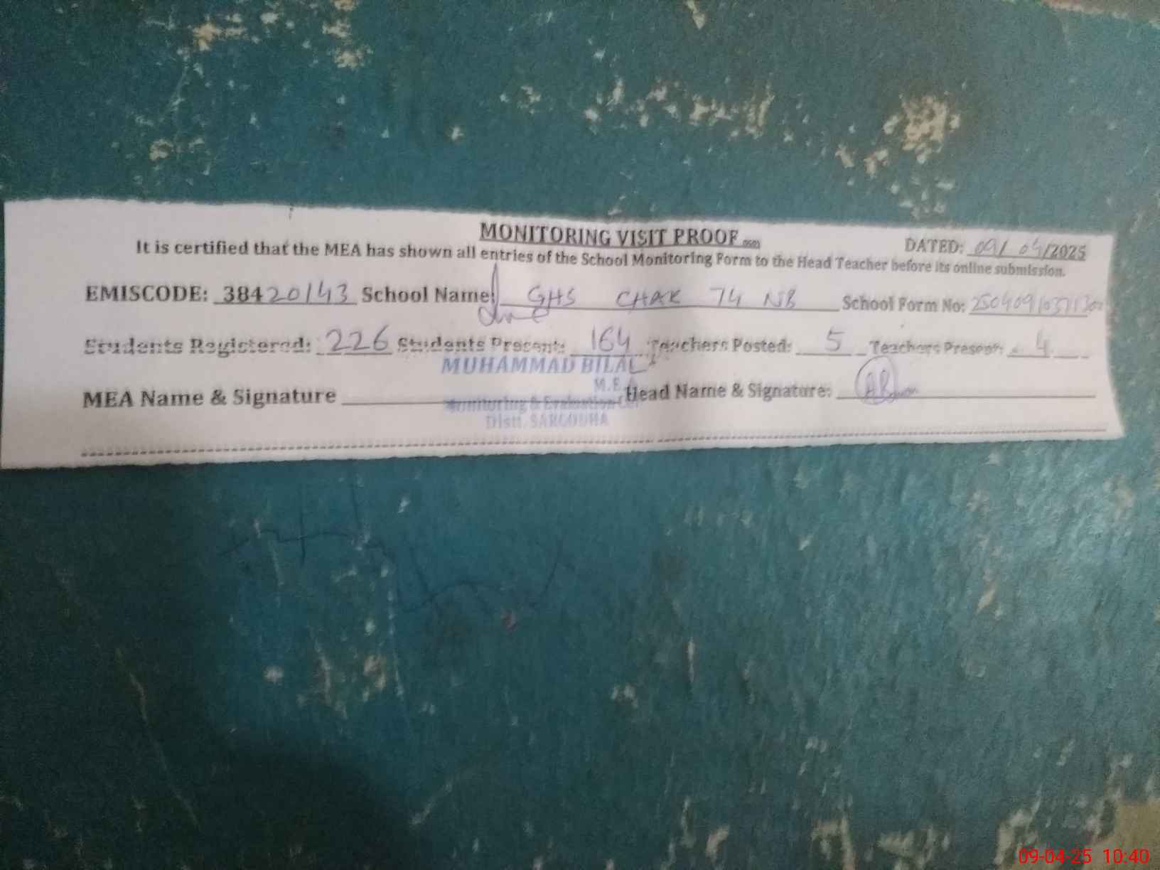| EMIS Code: 38420143 | Name of School: GHS CHAK NO.74 NB | |||