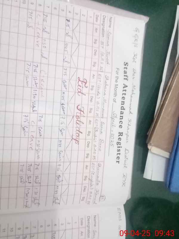 | Total no. of Classrooms: 7 No. of Classrooms Used for Teaching: 6 No. of Classrooms Storing Old Furniture, FTBs, etc: 0Comments if Any: Satisfactory teacher Naila leave not approved at visit time |