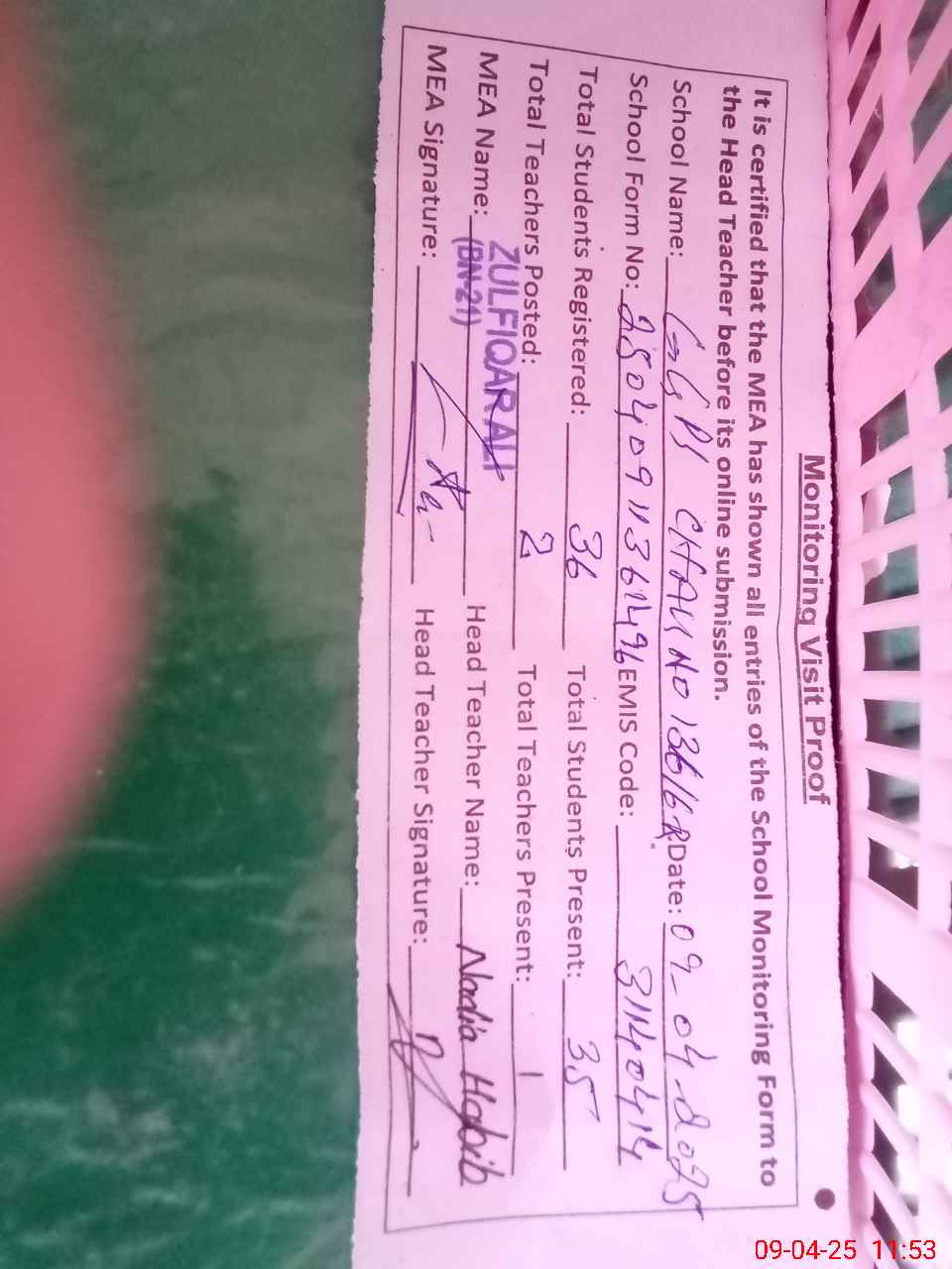 | Attendance Register | Head Teacher | MEA with School | Visit Proof |