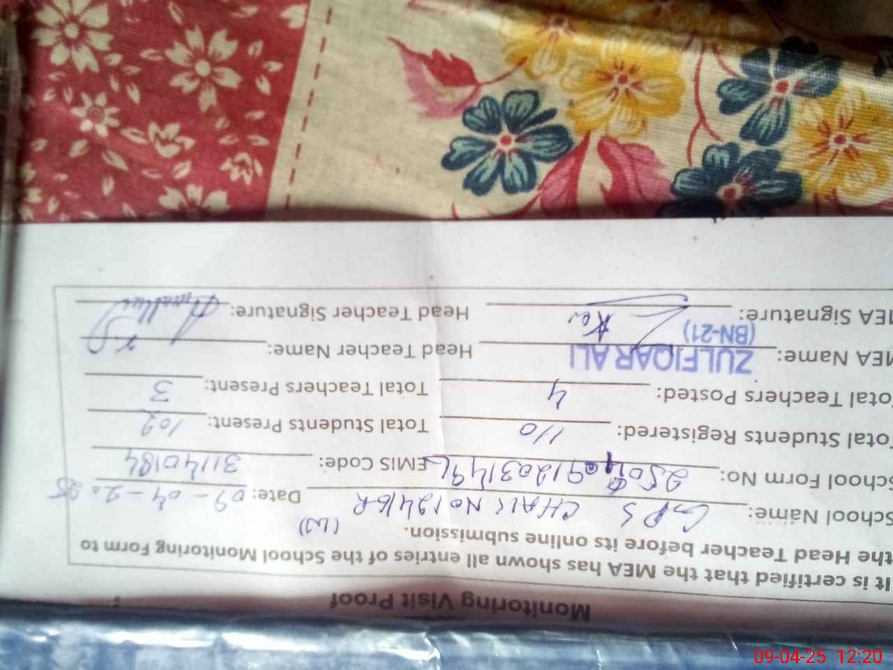 | Attendance Register | Head Teacher | MEA with School | Visit Proof |