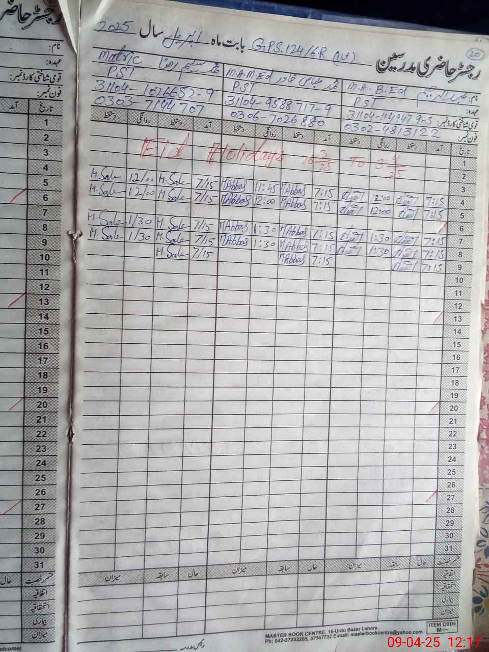 | CNIC | Full Name | Designation | R/C | Absence During Last Calender Month |