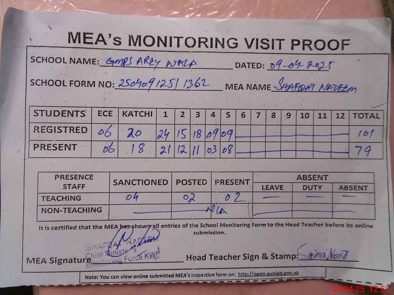 | Attendance Register | Head Teacher | MEA with School | Visit Proof |