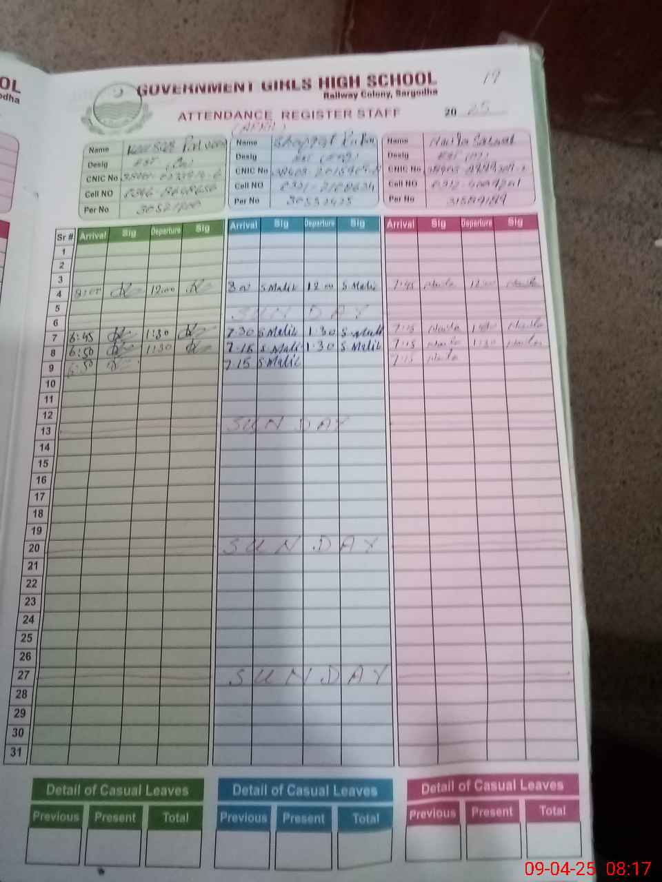 | CNIC | Full Name | Designation | R/C | Absence during last cal. month |
