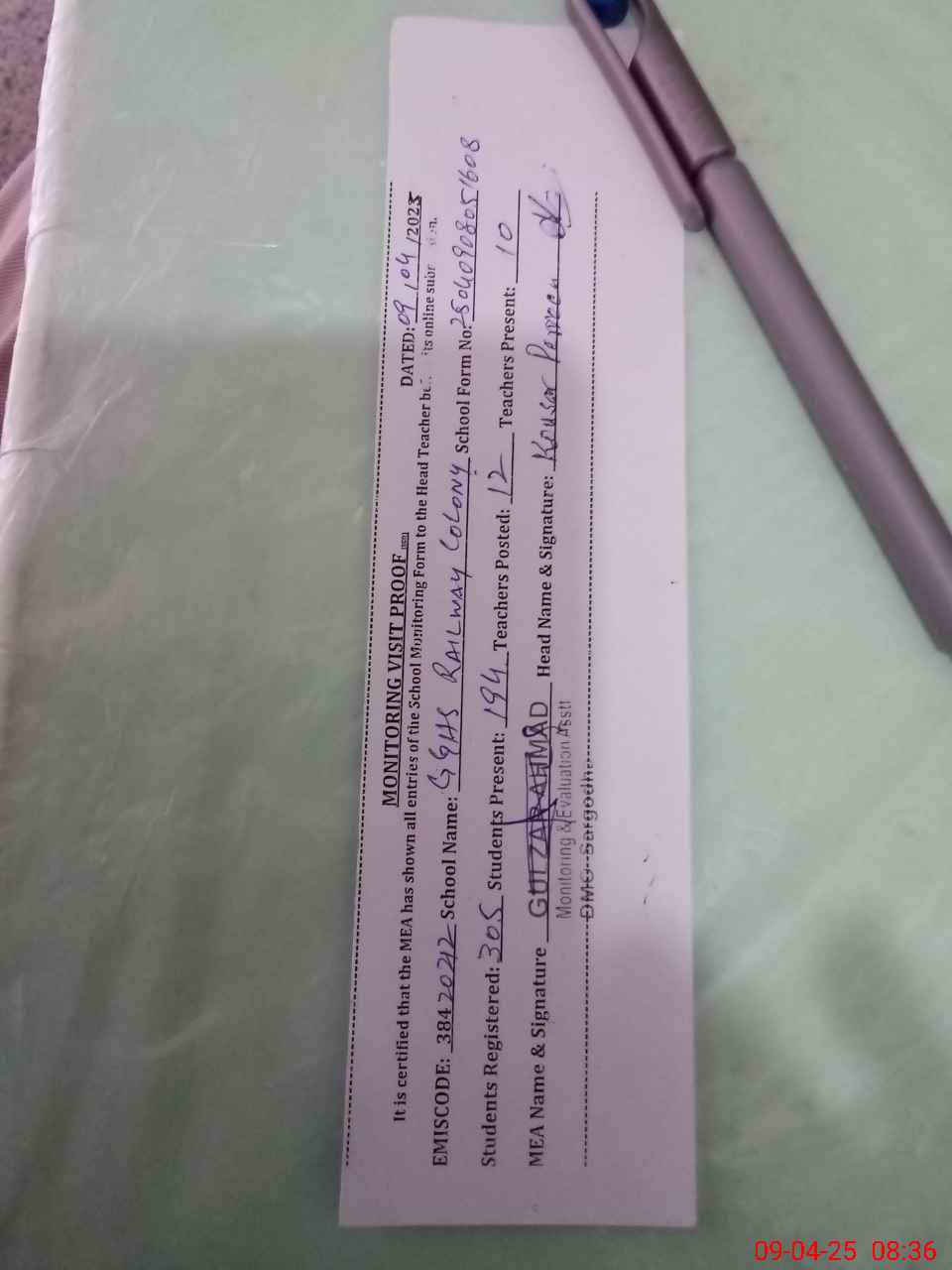 | Attendance Register | Head Teacher | MEA with School | Visit Proof |