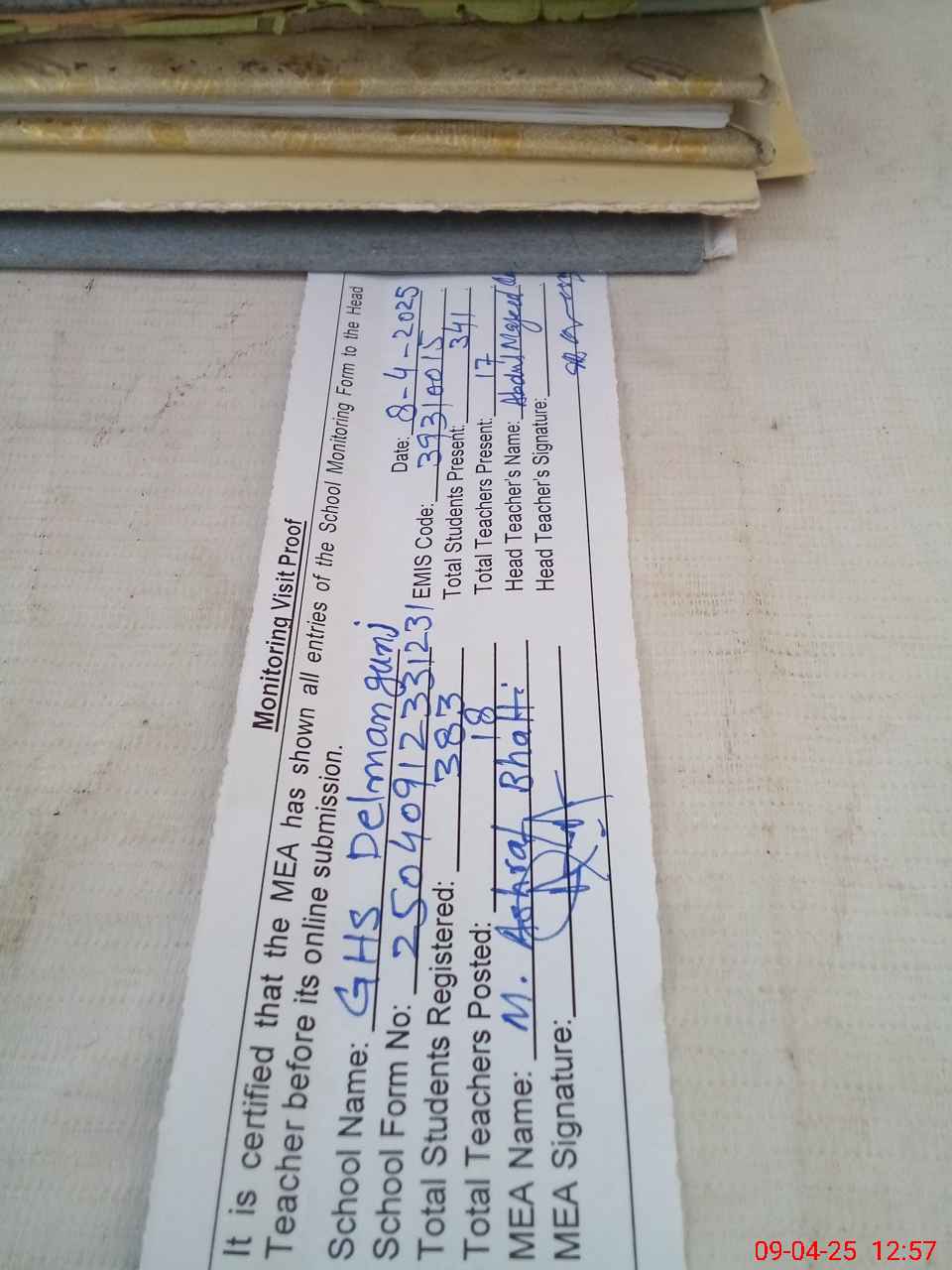| Attendance Register | Head Teacher | MEA with School | Visit Proof |