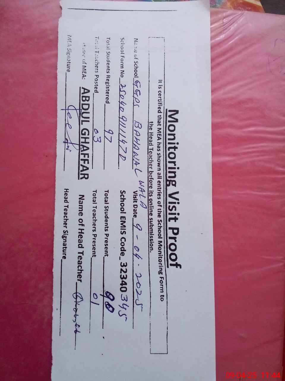 | Attendance Register | Head Teacher | MEA with School | Visit Proof |